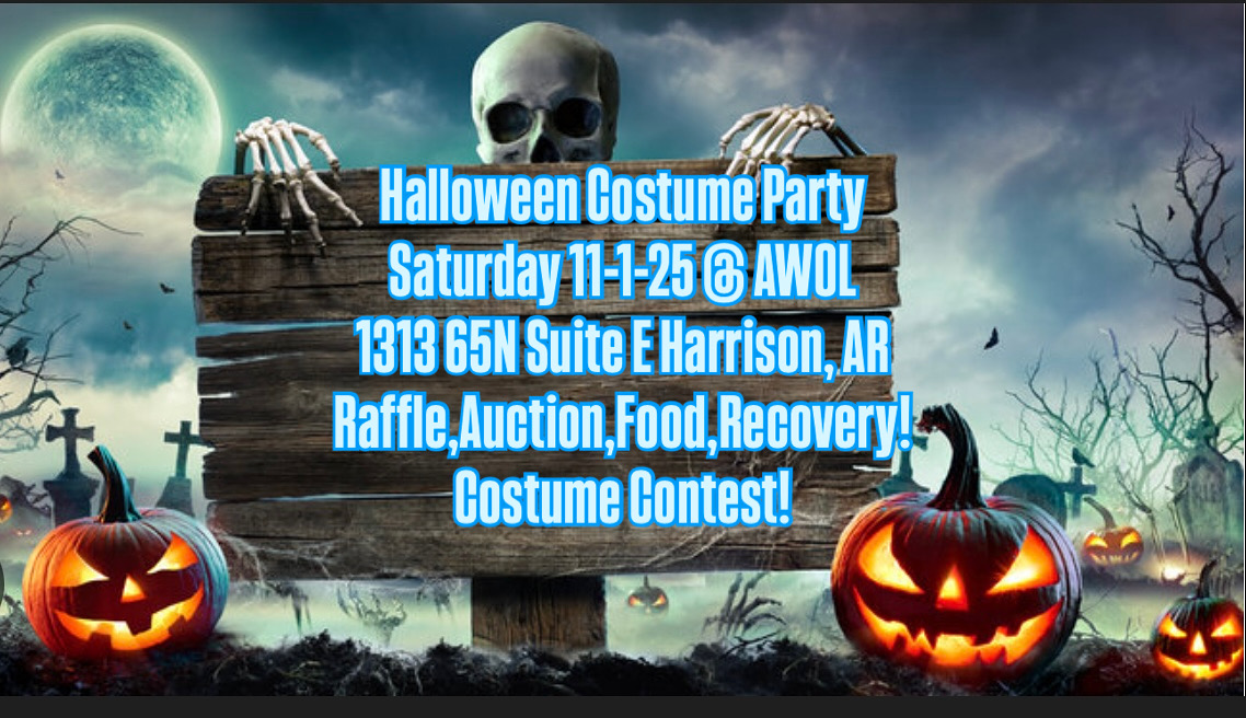 (Harrison) AWOL Costume Contest/Halloween Party! (Harrison) AWOL Costume Contest/Halloween Party! + Add to Google Calendar + iCal / Outlook export Date Nov 01 2025 Expired! Time 6:00 PM - 9:00 PM Location 1313 Highway 65N, Suite E, Harrison, AR 72601 1313 Highway 65N, Suite E, Harrison, AR 72601 Organizer AWOL Phone 8702042395 Email treasurerawol@gmail.com Share this event Event Flyer