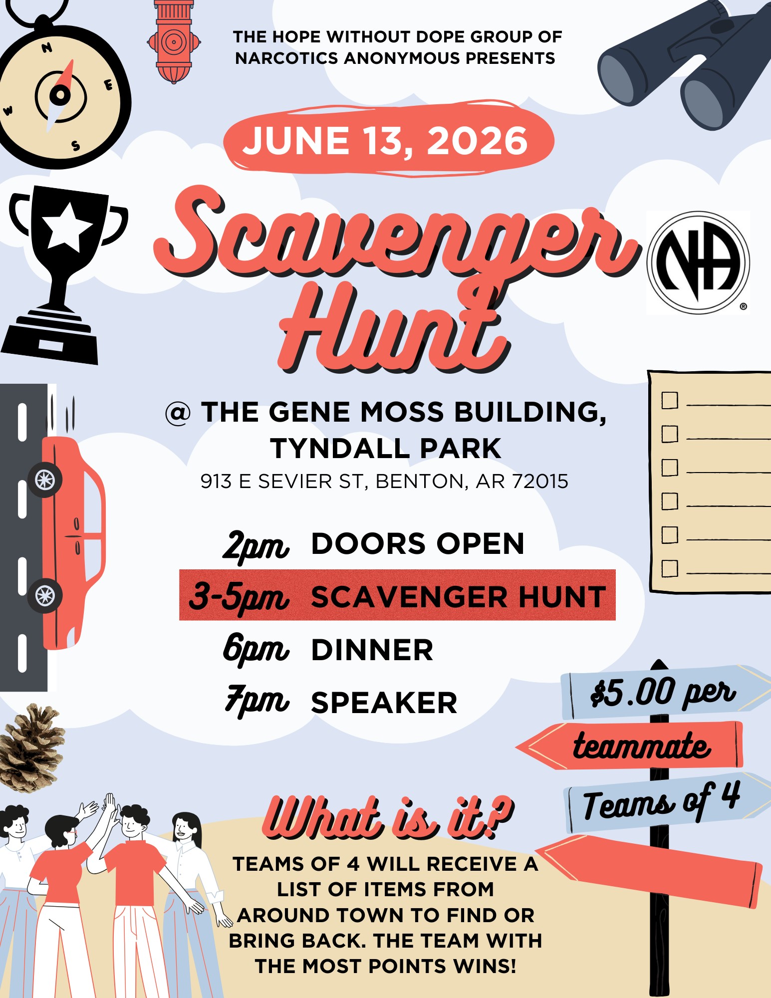 (Benton) Scavenger Hunt! (Benton) Scavenger Hunt! + Add to Google Calendar + iCal / Outlook export 00 days 00 hours 00 minutes 00 seconds Date Jun 13 2026 Time 2:00 PM - 8:00 PM Location Gene Moss Building-Benton 913 E Sevier St, Benton, AR 72015 Website http://www.bentonar.org/maps/location/genemoss Organizer Hope without Dope Group Phone 501-247-0451 Email janserenity@yahoo.com Share this event Event Flyer