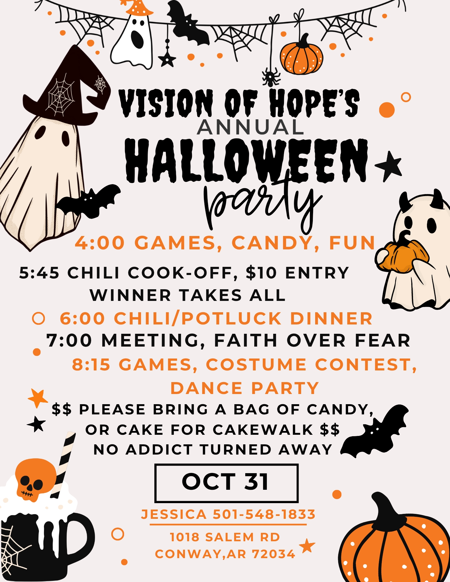 (Conway) Vision of Hope’s Halloween Party (Conway) Vision of Hope’s Halloween Party + Add to Google Calendar + iCal / Outlook export Date Oct 31 2025 Expired! Time Our regular scheduled meeting will still be held at 7:00 p.m. 4:00 PM - 10:00 PM Location Vision of hope 1018 Salem rd Conway AR 72034 Organizer Conway VOH Email 5013391549 Share this event Event Flyer