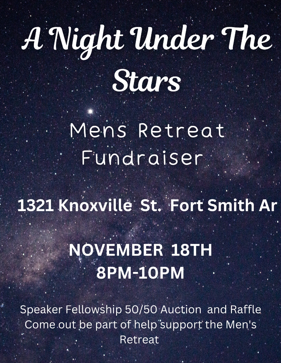 (Ft Smith) A Night Under the Stars Men’s Retreat Fundraiser (Ft Smith) A Night Under the Stars Men’s Retreat Fundraiser + Add to Google Calendar + iCal / Outlook export Date Nov 18 2023 Expired! Time 8pm till 10pm 8:00 PM - 10:00 PM Location Grateful Heads Group 1321 Knoxville Street, Fort Smith, AR Organizer ARVANA Share this event Event Flyer