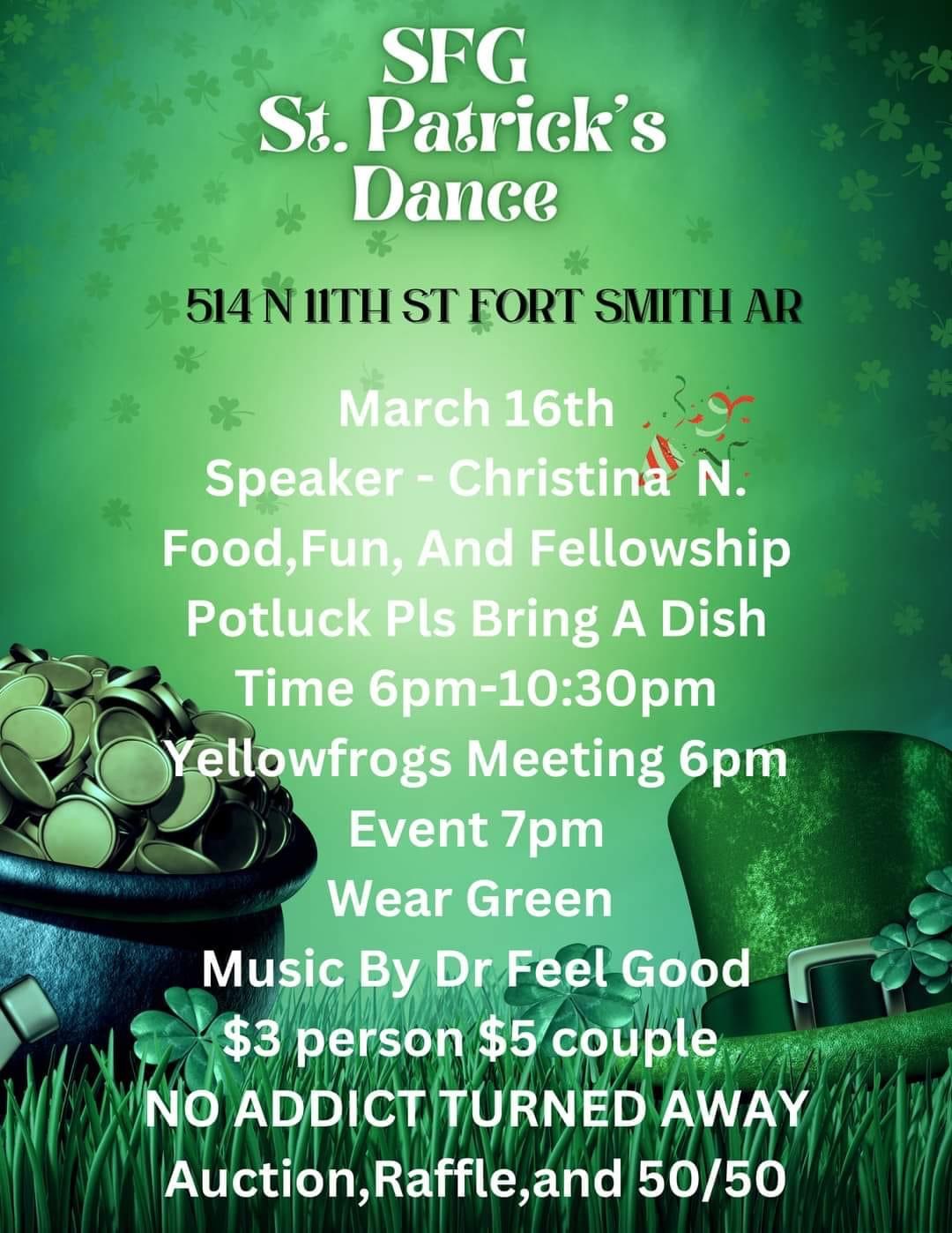 (Ft. Smith) SFG St Patrick’s Day Dance (Ft. Smith) SFG St Patrick’s Day Dance + Add to Google Calendar + iCal / Outlook export Date Mar 16 2024 Expired! Time 6:00 AM - 10:30 PM Location Straight Forward Group (SFG) 422 N Greenwood Ave, Fort Smith AR Organizer Straight Forward Group (SFG) Share this event Event Flyer