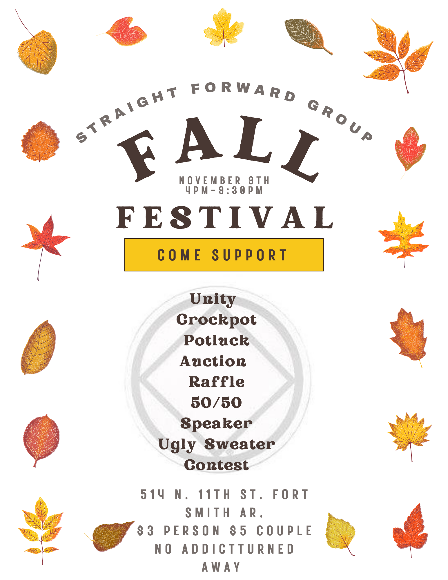 (Ft. Smith) Straight Forward Fall Festival (Ft. Smith) Straight Forward Fall Festival + Add to Google Calendar + iCal / Outlook export Date Nov 09 2024 Expired! Time 4:00 PM - 9:30 PM Location 514 N. 11th, Fort Smith, AR 514 N. 11th, Fort Smith, AR Organizer Straight Forward Group (SFG) Share this event Event Flyer