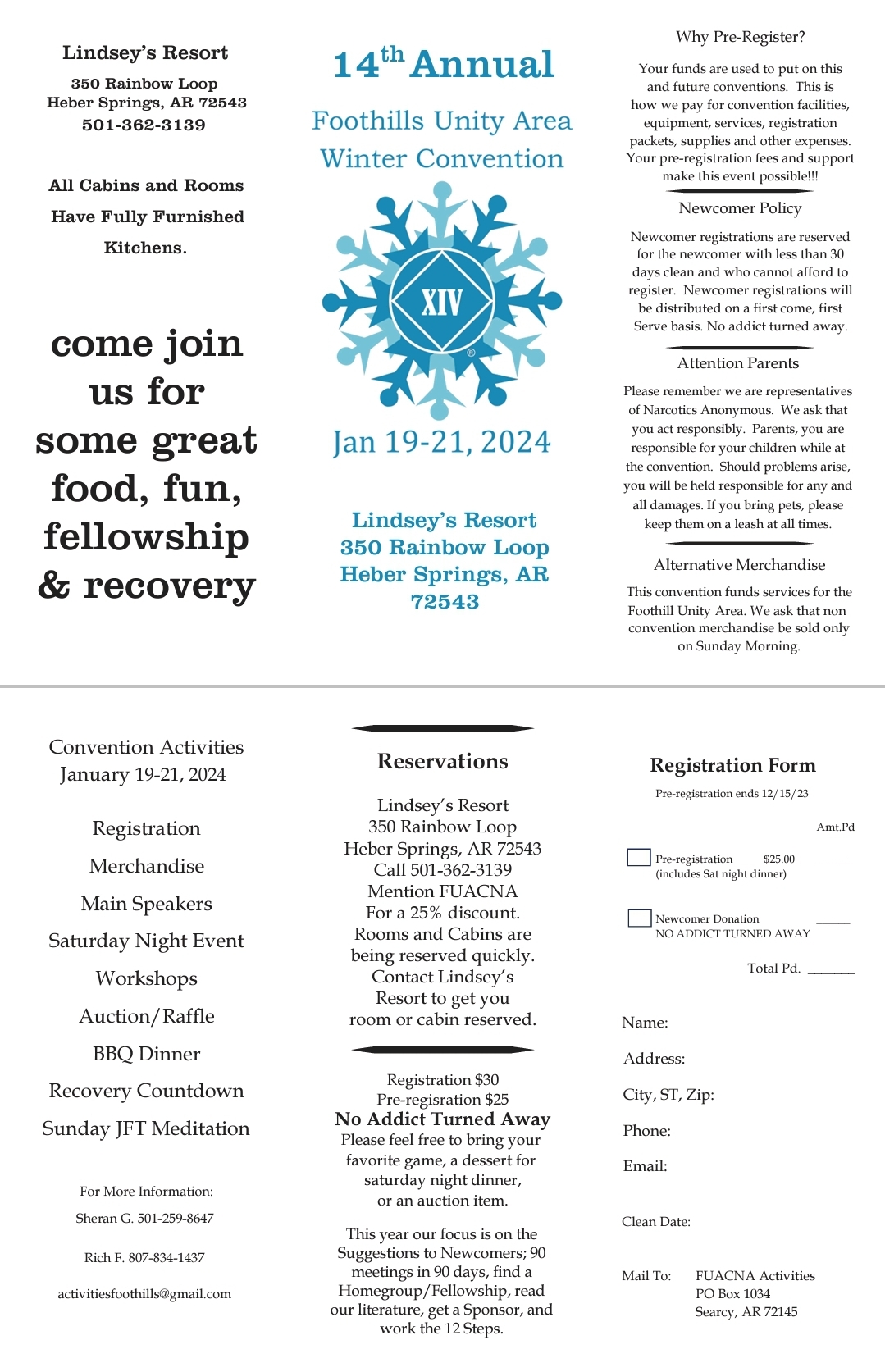(Heber Springs) FUACNA Winter Convention XIV (Heber Springs) FUACNA Winter Convention XIV + Add to Google Calendar + iCal / Outlook export Date Jan 19 - 21 2024 Expired! Time All Day Location Lindsey's Rainbow Resort 350 Rainbow Loop Heber Springs, AR 72543 Organizer FUACNA Email activitiesfoothills@gmail.com Share this event Event Flyer