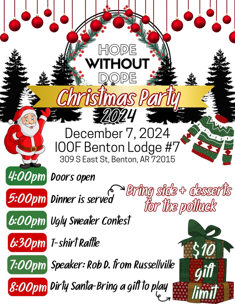 (Benton) HWOD Christmas Party (Benton) HWOD Christmas Party + Add to Google Calendar + iCal / Outlook export Date Dec 07 2024 Expired! Location Benton Bingo Hall 309 S East St., Benton, AR 72015 Organizer Hope without Dope Group Phone 501-247-0451 Email janserenity@yahoo.com Share this event Event Flyer
