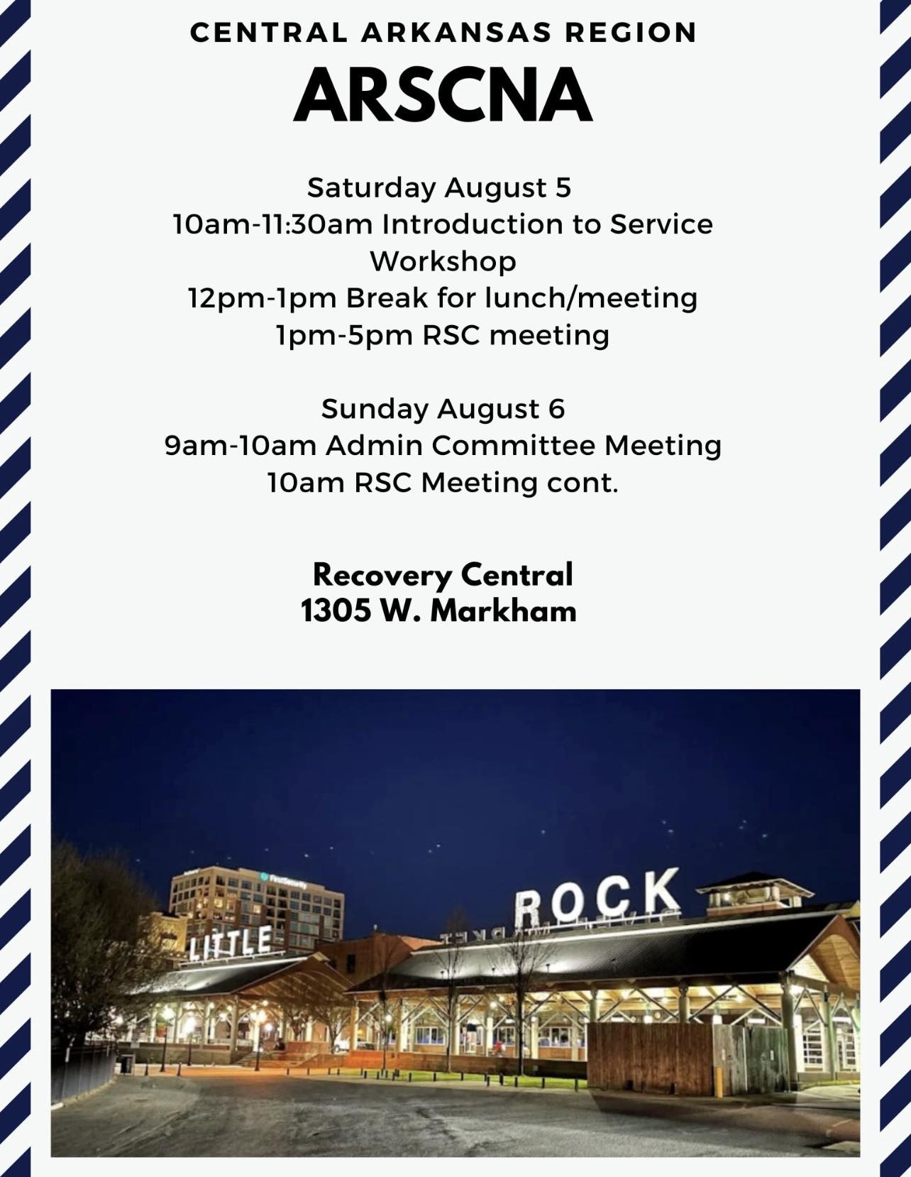 (LR) ARSCNA RSC MEETING (LR) ARSCNA RSC MEETING + Add to Google Calendar + iCal / Outlook export Date Aug 05 - 06 2023 Expired! Time 10:00 AM - 4:00 PM Location Recovery Central 1305 W. Markham, Little Rock, AR Share this event Event Flyer