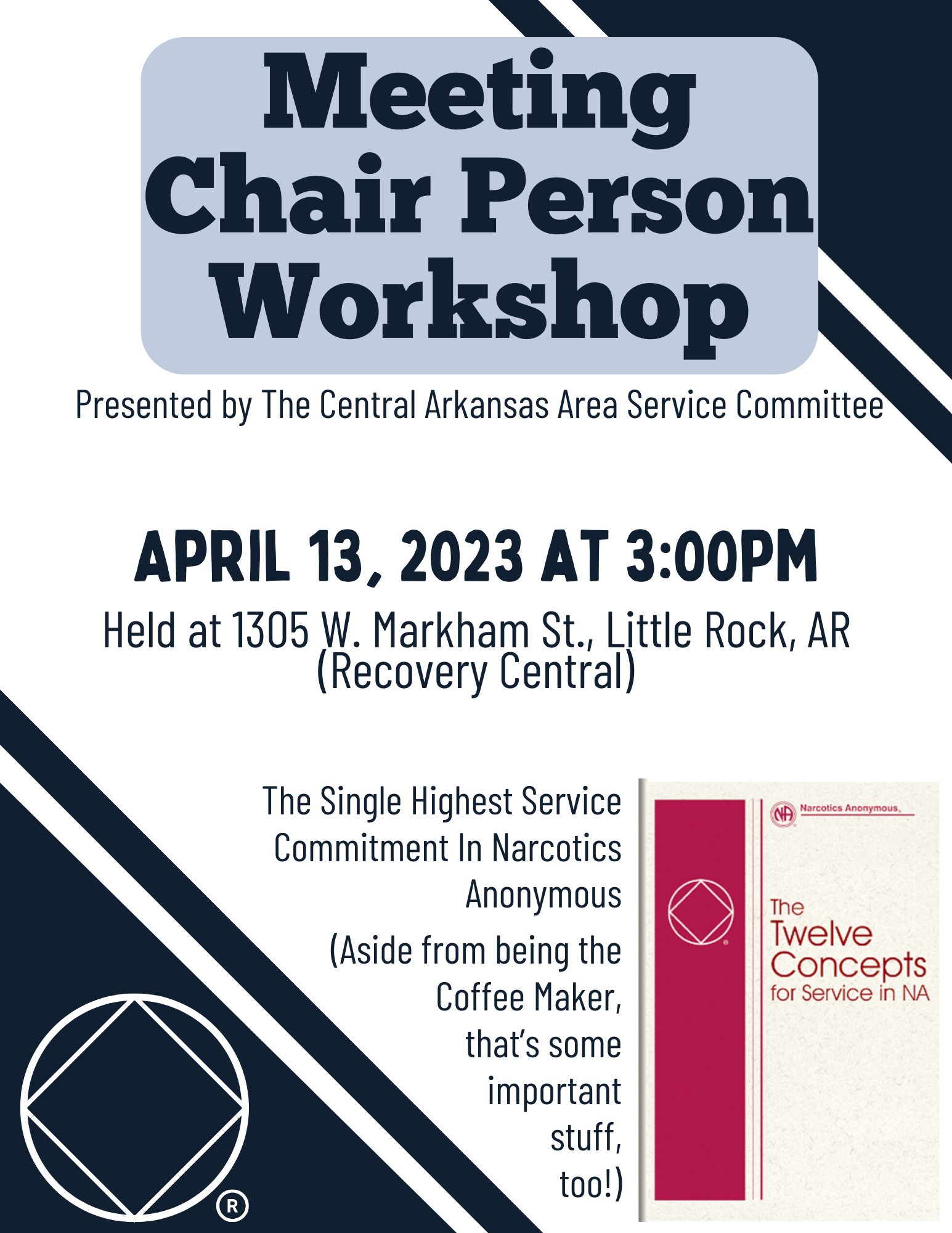 (LR) ASC Chairperson Workshop (LR) ASC Chairperson Workshop + Add to Google Calendar + iCal / Outlook export Date Apr 13 2024 Expired! Time 3:00 PM Location Recovery Central 1305 W. Markham, Little Rock, AR Organizer Central AR Area Service Committee Share this event Event Flyer