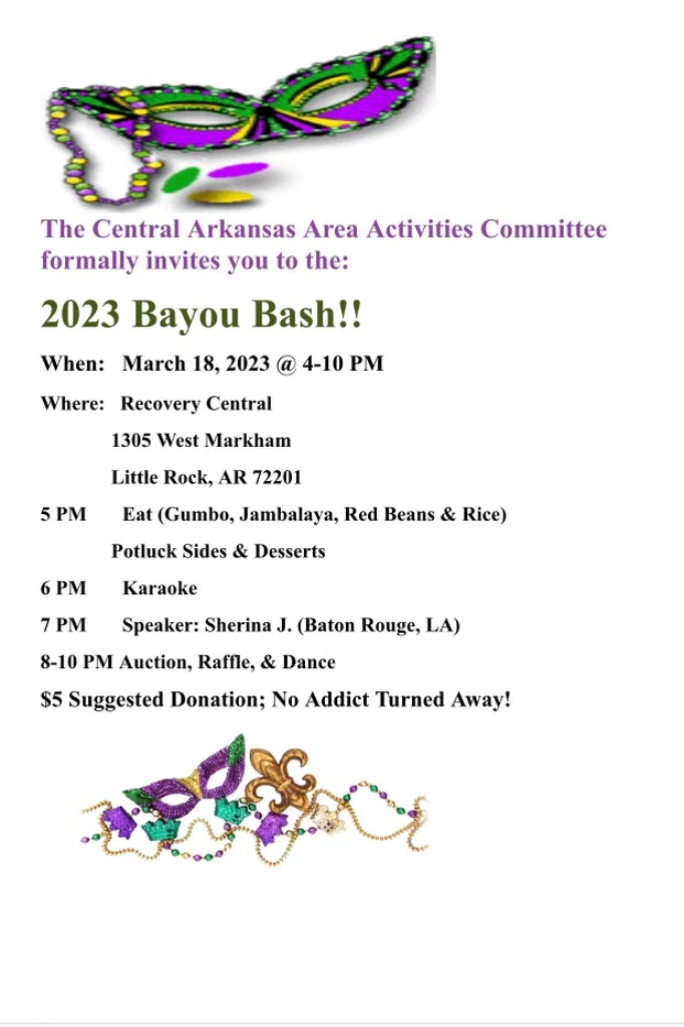 Central Arkansas Activities Committee is having a Cajun Party! This will include a Cajun dinner, Karaoke, Speaker meeting, and dance to follow!