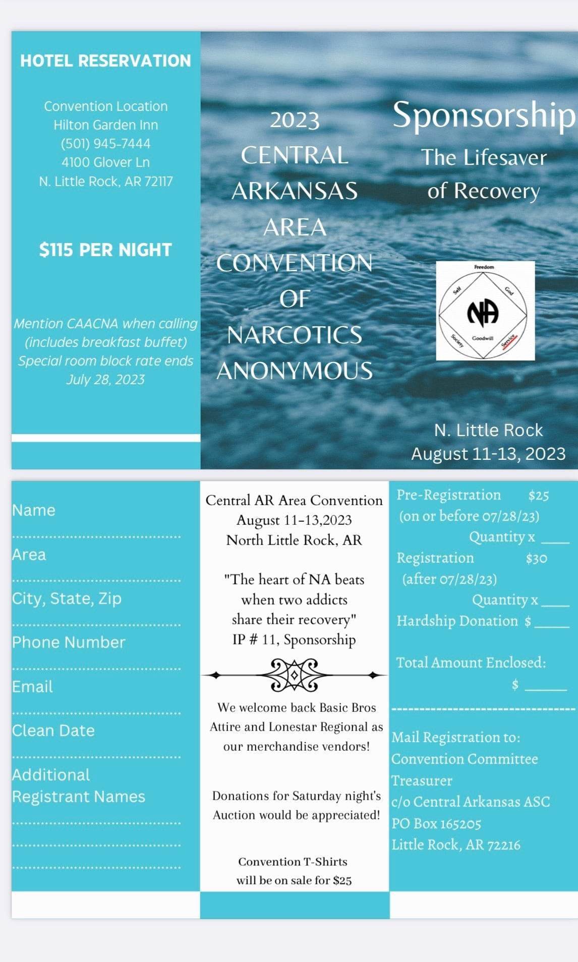(LR) Central Arkansas Area Convention of Narcotics Anonymous (LR) Central Arkansas Area Convention of Narcotics Anonymous + Add to Google Calendar + iCal / Outlook export Date Aug 11 - 13 2023 Expired! Time All Day Location Hilton Garden Inn (LR) 4100 Glover Lane, North Little Rock, AR Organizer CACCNA Share this event Registration Flyer