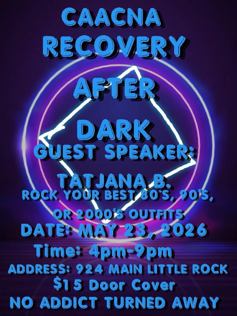 (LR) Recovery After Dark (LR) Recovery After Dark + Add to Google Calendar + iCal / Outlook export 00 days 00 hours 00 minutes 00 seconds Date May 23 2026 Time 4:00 PM - 9:00 PM Location 924 Main Street, Little Rock, AR 72202 924 Main Street, Little Rock, AR 72202 Organizer CACCNA Share this event Event Flyer