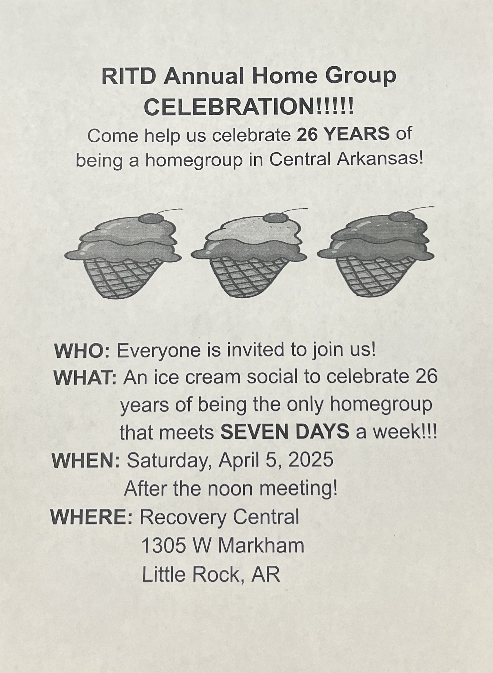 (LR) RITD 26th Anniversary Ice Cream Social Celebration (LR) RITD 26th Anniversary Ice Cream Social Celebration + Add to Google Calendar + iCal / Outlook export Date Apr 05 2025 Expired! Time Immediately following the noon meeting. 1:15 PM - 2:30 PM Location Recovery Central 1305 W. Markham, Little Rock, AR Organizer RITD Share this event Event Flyer
