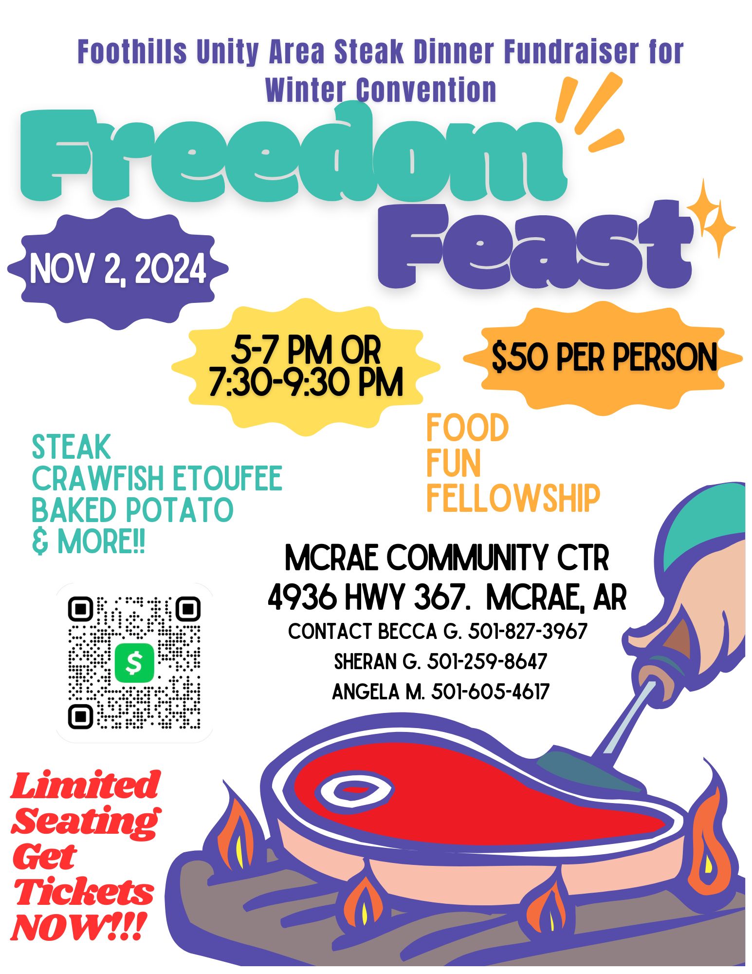 (McRae) Freedom Feast (McRae) Freedom Feast + Add to Google Calendar + iCal / Outlook export Date Nov 02 2024 Expired! Time 5:00 PM - 9:30 PM Location McRae Community Center Hwy 367, McRae, Arkansas Organizer FUACNA Email activitiesfoothills@gmail.com Share this event Event Flyer