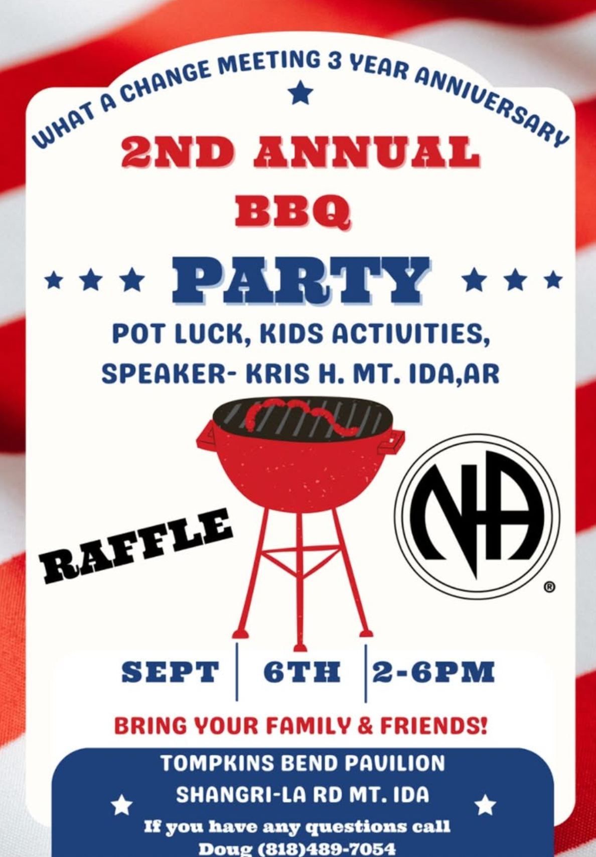 (Mt. Ida) What a Change Anniversary BBQ (Mt. Ida) What a Change Anniversary BBQ + Add to Google Calendar + iCal / Outlook export Date Sep 06 2025 Expired! Time 2:00 PM - 6:00 PM Location Tompkins bend campground Shangri-La road Mt Ida, AR Organizer What A Change Group Share this event Event Flyer