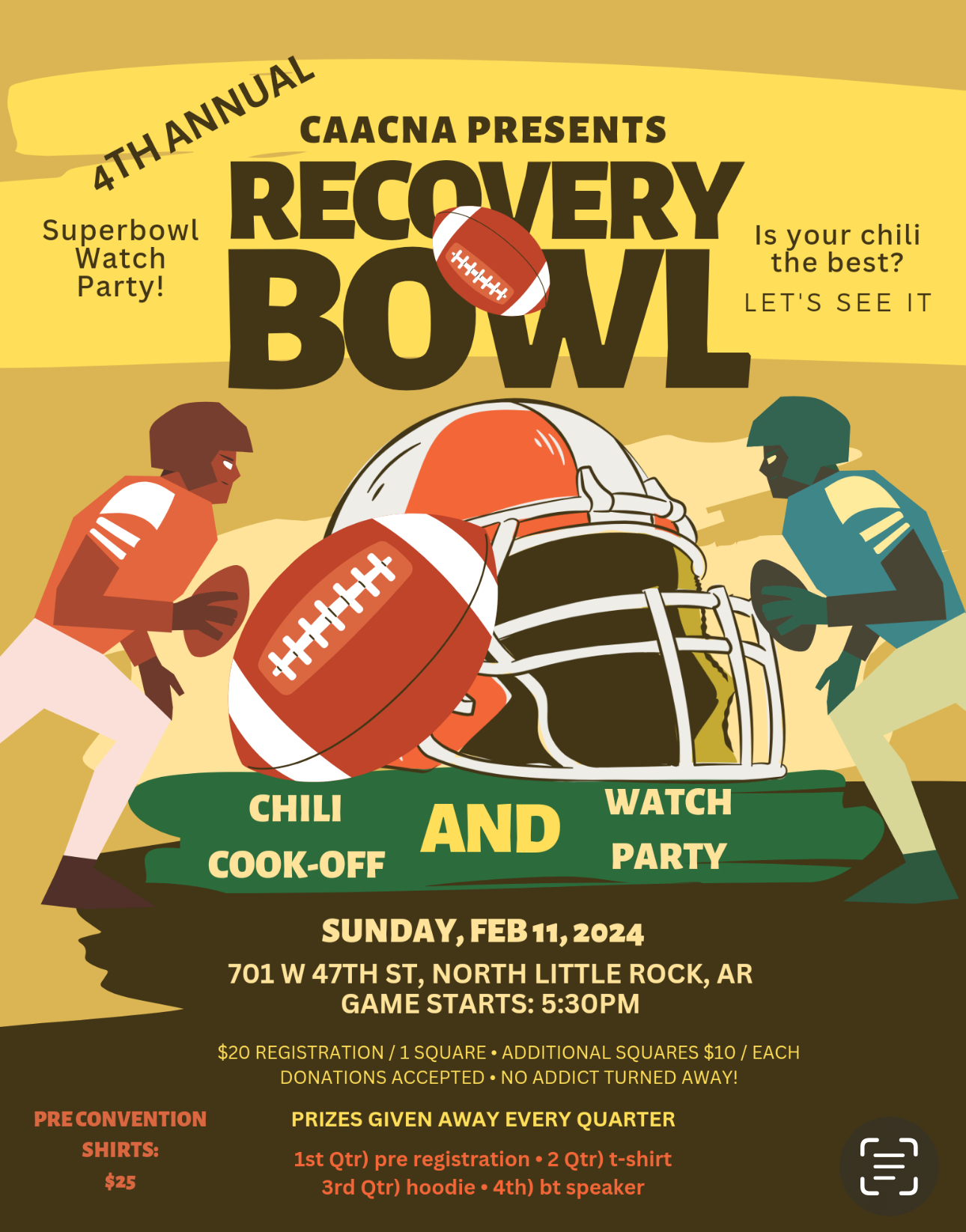 (North Little Rock) 4th Annual Super Bowl Watch Party and Chili Cookoff (North Little Rock) 4th Annual Super Bowl Watch Party and Chili Cookoff + Add to Google Calendar + iCal / Outlook export Date Feb 11 2024 Expired! Time Game starts at 5:30 come early eat chili 5:00 PM Location Levy United Methodist Church 701 W. 47th Street, North Little Rock, AR Organizer CACCNA Share this event Event Flyer