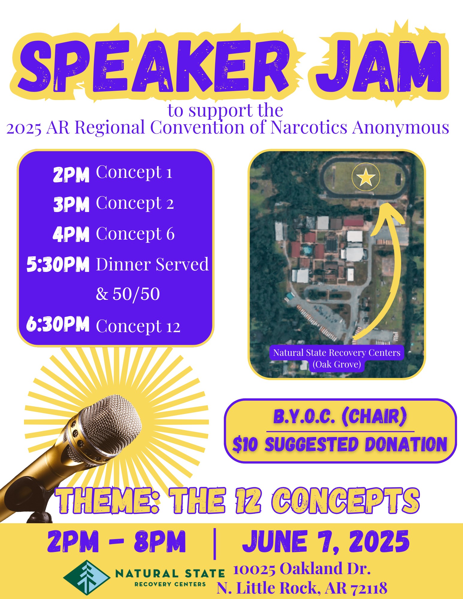 (LR) Speaker Jam (LR) Speaker Jam + Add to Google Calendar + iCal / Outlook export Date Jun 07 2025 Expired! Time 2:00 PM - 8:00 PM Location Natural State Recovery Center 10025 Oakland Dr., Little Rock, AR 72118 Organizer ARSCNA Share this event Event Flyer