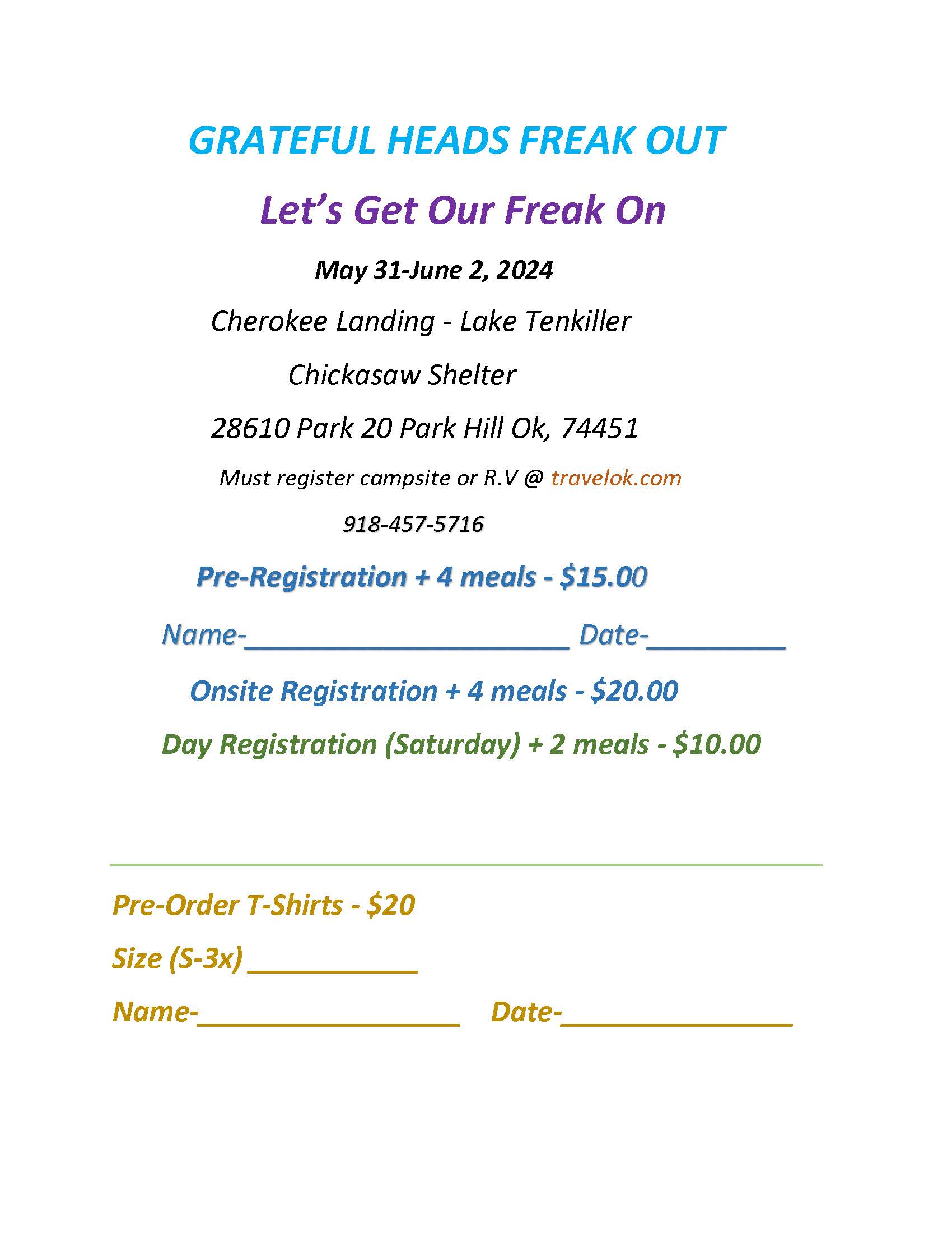 (Tenkiller Lake, OK) Grateful Heads Freakout 2024 (Tenkiller Lake, OK) Grateful Heads Freakout 2024 + Add to Google Calendar + iCal / Outlook export Date May 31 2024 - Jun 02 2024 Expired! Time All Day Location Cherokee Landing Lake Tenkiller State Park, Vian, OK Organizer Grateful Heads Share this event Event Flyer