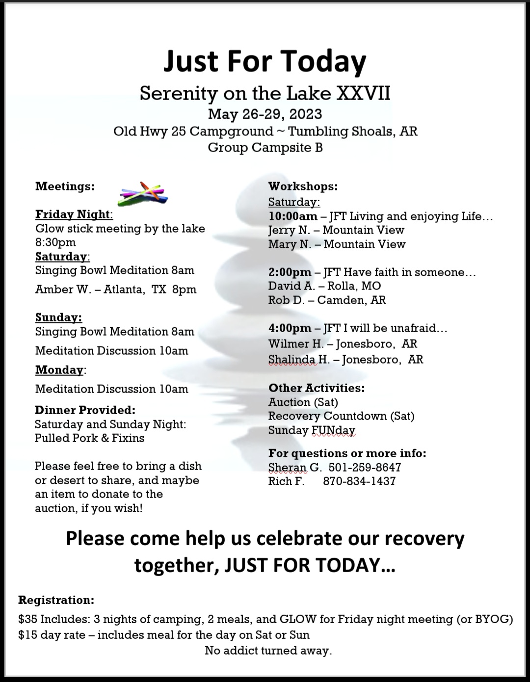 (Tumbling Shoals) Serenity on the Lake Campout 2023 (Tumbling Shoals) Serenity on the Lake Campout 2023 + Add to Google Calendar + iCal / Outlook export Date May 26 - 29 2023 Expired! Time 4:00 PM - 4:00 PM Location Old Highway 25 Campgrounds AR-25 Spur, Tumbling Shoals, AR Opening Hour 16:00 Organizer FUACNA Email activitiesfoothills@gmail.com Share this event Event Flyer & Agenda