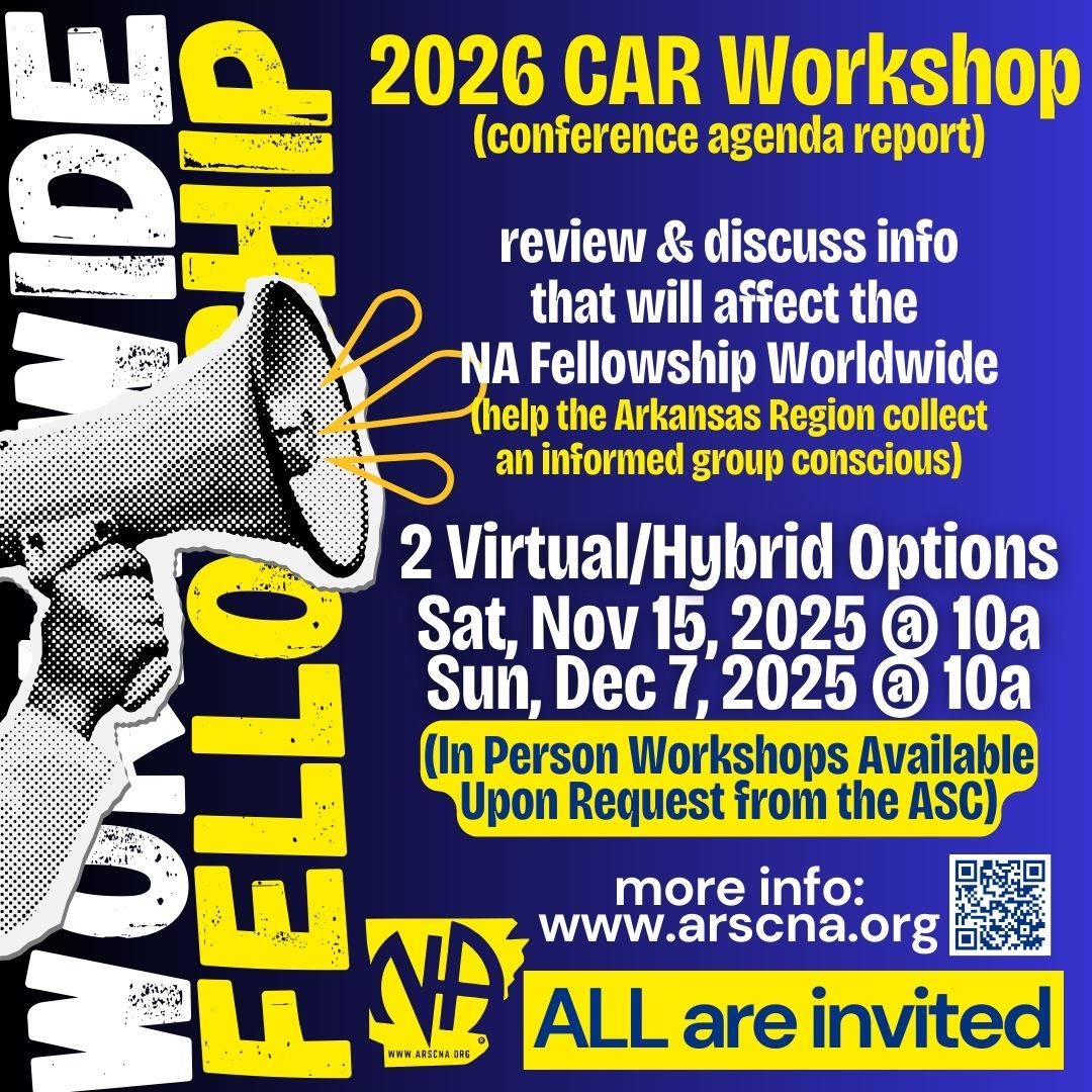 Every two years, the World Service Conference (WSC) makes decisions that affect the future of NA worldwide. Those decisions come from the consensus of the worldwide fellowship to issues and motions in the Conference Agenda Report (CAR), which will be released November 3rd. The Arkansas Delegate Team wants to give our Areas and members plenty of time to review, discuss, and build consensus together.