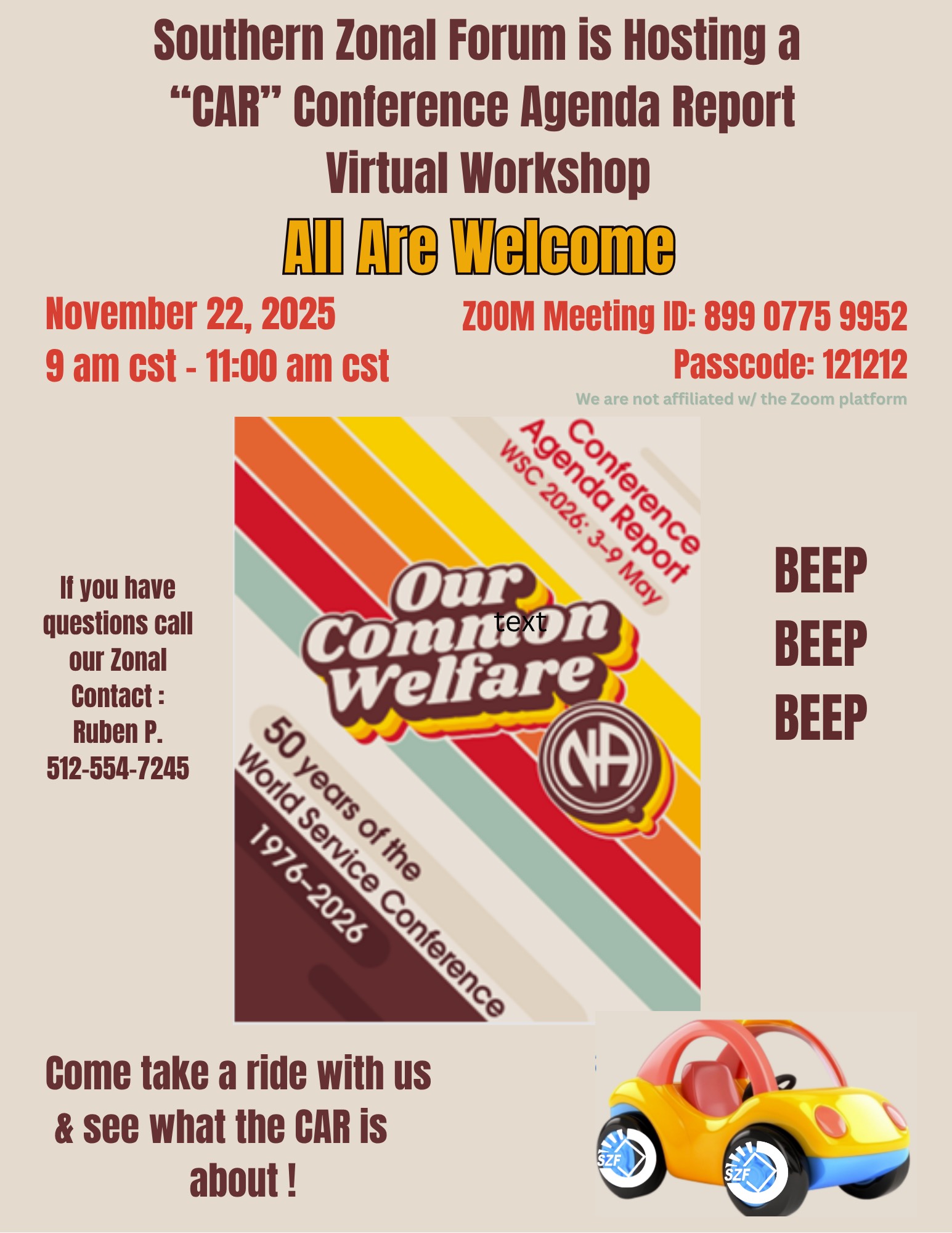 (Virtual) SZF CAR Workshop (Virtual) SZF CAR Workshop + Add to Google Calendar + iCal / Outlook export 00 days 00 hours 00 minutes 00 seconds Date Nov 22 2025 Time 9:00 AM - 11:00 AM Organizer Southern Zonal Forum (SZF) Share this event Event Flyer
